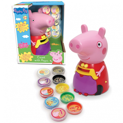 Count with Peppa helps develop counting skills plus colour and picture recognition. Comes with 10 interactive play coins. Peppa asks the child to insert coins into her purse. 8 different activities encourage the child to look for different numbers, colours and pictures. Peppa recognises which coins have been inserted and responds accordingly. Also plays 3 songs from the TV series.